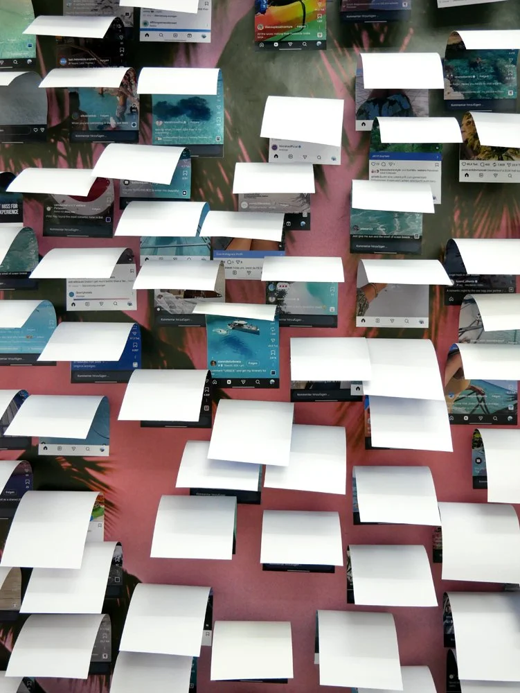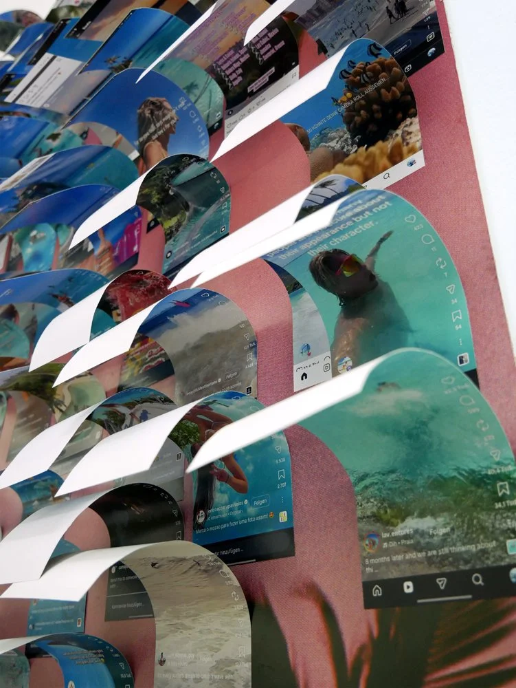 We’re seeing new things explore la représentation de l’expérience vacancière et interroge la construction du mythe de ce phénomène social. L’installation utilise des captures d'écran de publications provenant des réseaux sociaux, réalisées par des influenceurs.euses, des hôtels, des restaurants et des vacanciers et mettant en scène une imagerie balnéaire exotique. Alors que la sélection des destinations de vacances se fait de plus en plus à l’aide des réseaux sociaux, ces contenus proposent des expériences présentées comme authentiques et accessibles à tous.tes. Ces publications, issues d'un processus consumériste, sont cependant déterminées par des codes esthétiques et une standardisation de leur contenu.