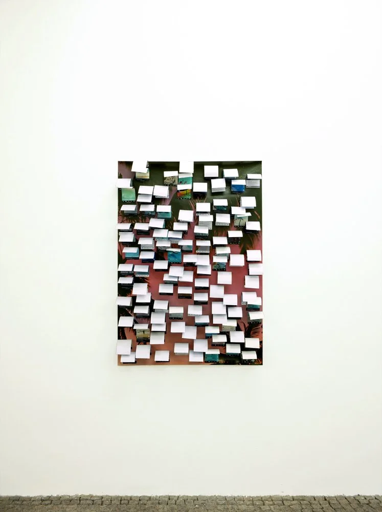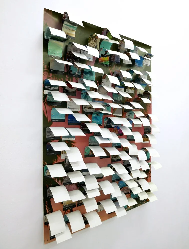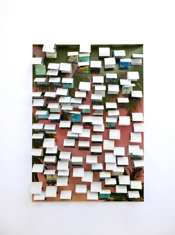 Les publications sont imprimées et juxtaposées sur une photo-tapisserie datant des années 1990 et représentant un coucher de soleil sur une plage de palmiers. La tapisserie participe à l'imaginaire des vacances en tant qu'objet de promotion, mais n'est pas le reflet d'une expérience vécue. Datant d’une autre époque, elle est réunie avec des publications actuelles qui ensemble proposent une lecture dans le temps de la représentation vacancière.
